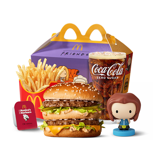 В меню вас ждут наши хиты вкуса: Big Mac®, McChicken®, Дабл Чизбургер, Роял Чизбургер или 9 шт. McNuggets®. К ним прилагается средняя порция картошки фри, средний напиток и соус Monica’s Marinara. Все эти блюда подаются в специальной упаковке Friends – вы почувствуете особое настроение еще до того, как откроете ее.